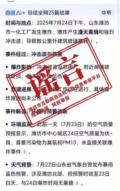 近日,有网民引用AI生成文章称“2025年7月24日潍坊发生爆炸事故”。经核实,网民听到的巨响为飞机音爆,网络上流传“潍坊市发生爆炸事故”的说法是谣言。