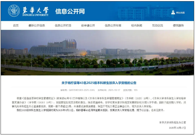 近日,东华大学在学校官网上发布关于43名2025级本科新生放弃入学资格的公告,引发关注。