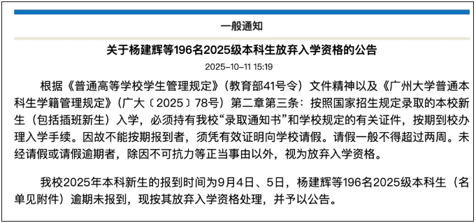广州大学教务处10月11日就发布公告称,有196名2025级本科生逾期未报到,按其放弃入学资格处理。