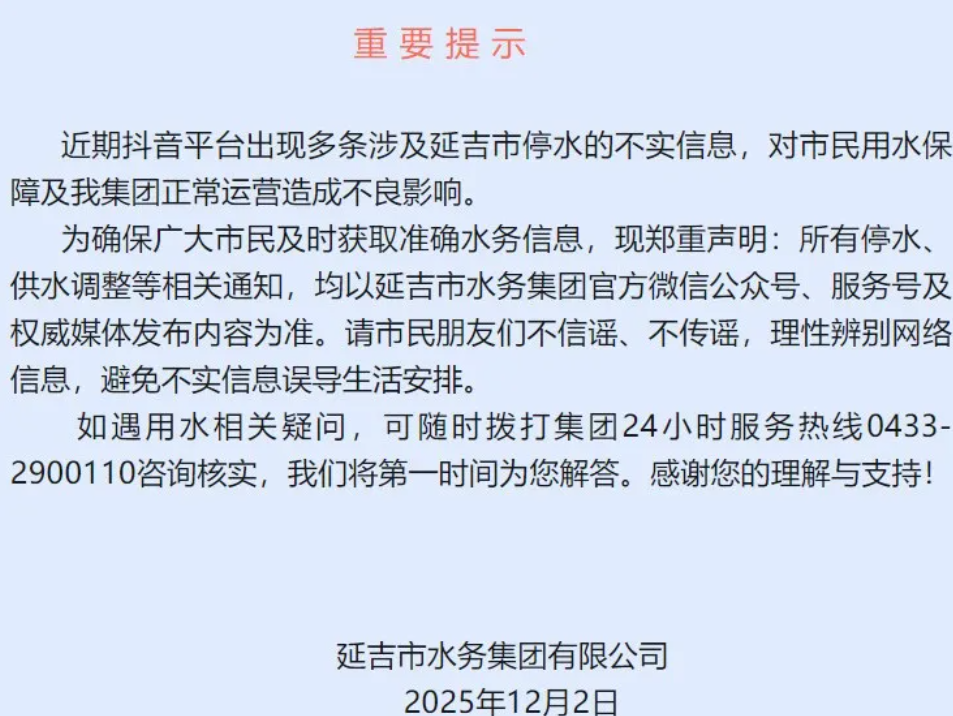 【吉林辟谣在线】延吉市水务集团发布郑重声明