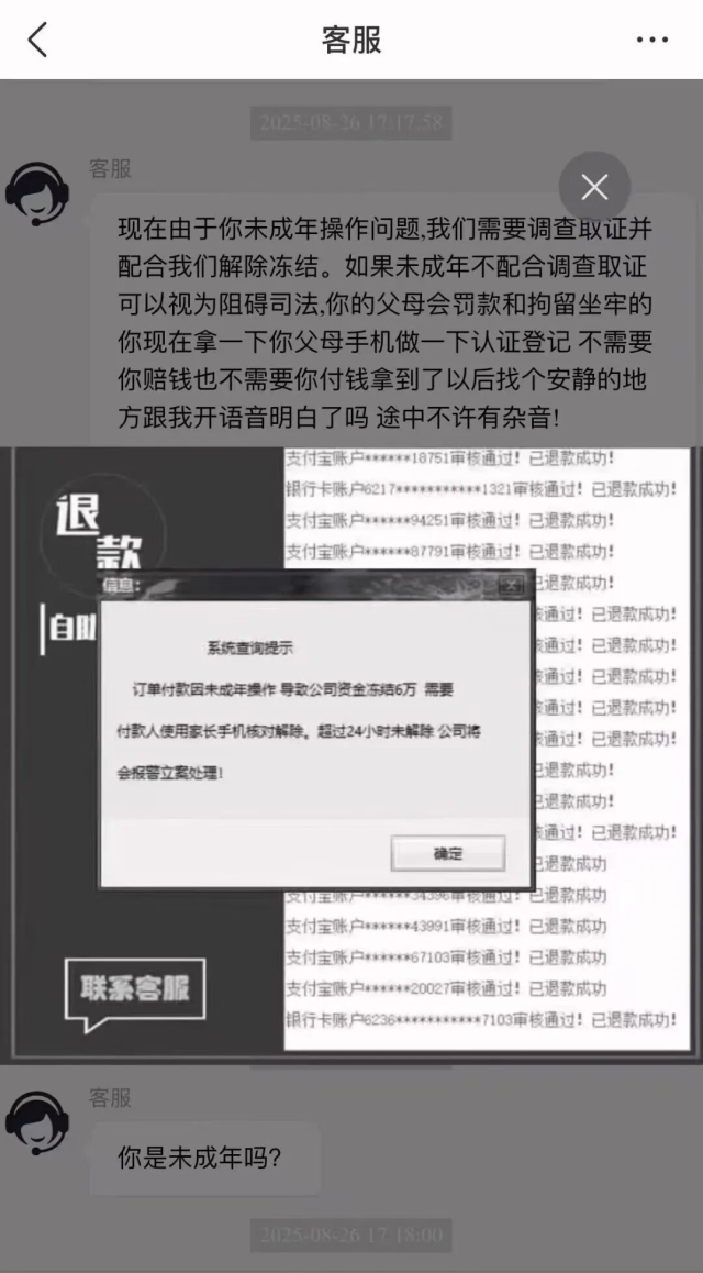 以检测到未成年人属于违规操作,导致账户被冻结为由,诱导他们转账,或者以配合调查为名,要求学生偷拿家长手机,通过视频连线,诱导学生点开付款链接支付转账,甚至直接获取手机验证码来进行转账。