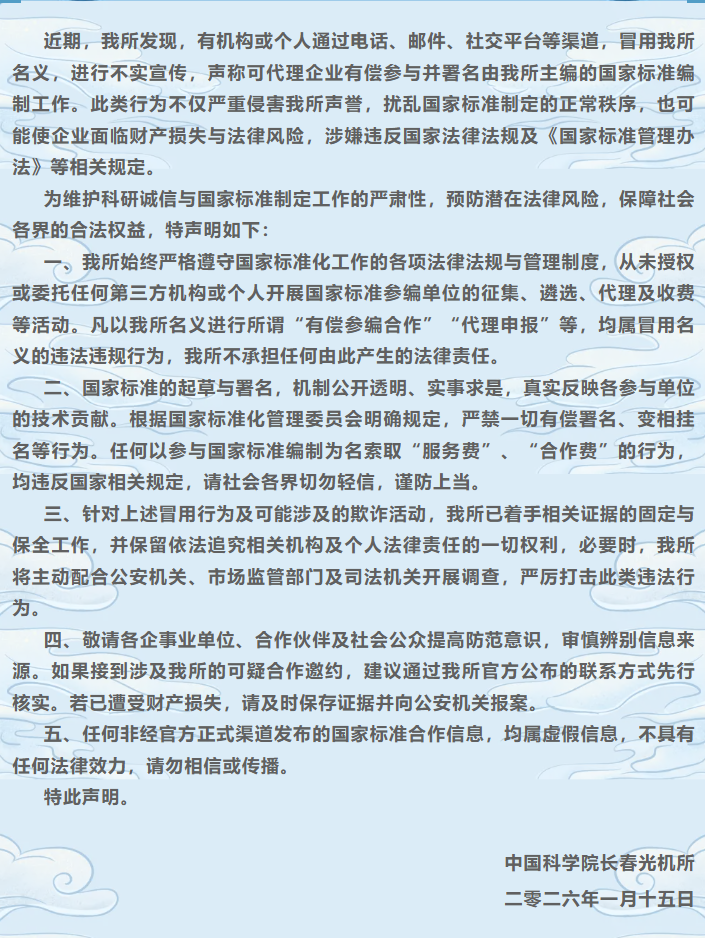 近期,有机构或个人冒用中国科学院长春光机所名义,开展有偿代理国家标准编制署名的不实宣传。对此,长春光机所发布《郑重声明》,从未授权或委托任何第三方机构或个人开展国家标准参编单位的征集、遴选、代理及收费等活动;任何以参与国家标准编制为名索取“服务费”“合作费”的行为,均违反国家相关规定。目前已着手相关证据的固定与保全工作,并保留依法追究相关机构及个人法律责任的一切权利。提醒社会公众提高防范意识,审慎辨别信息来源。任何非经官方正式渠道发布的国家标准合作信息,均属虚假信息。
