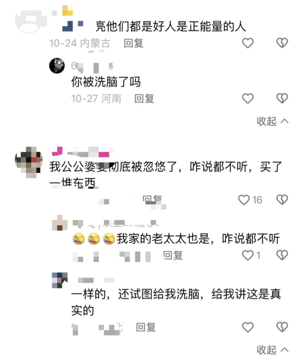 网约车司机康师傅告诉记者,“直播间里卖的保健品,我家里老头老太太老愿意买了,他们也发现不了是假的,这东西吃不好也吃不坏。”康师傅说,作为子女很多时候制止不了老人,老人买了也就买了。