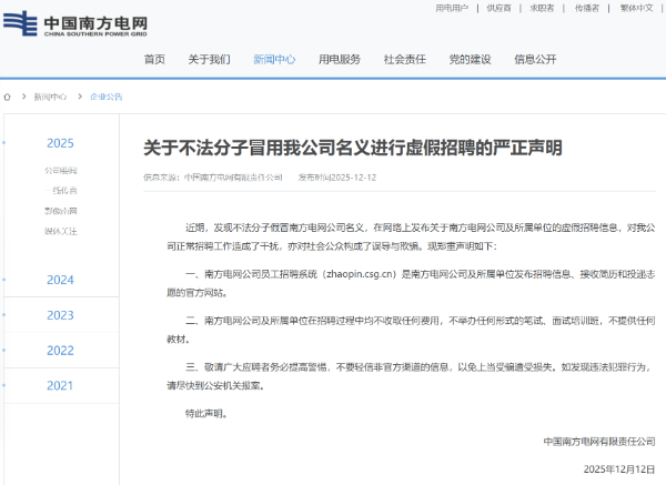 近期,一些不法分子假冒南方电网公司名义,在网络上发布关于南方电网公司及所属单位的虚假招聘信息。对此,中国南方电网有限责任公司郑重声明:公司员工招聘系统(zhaopin.csg.cn)是南方电网公司及所属单位发布招聘信息、接收简历和投递志愿的官方网站;招聘过程中均不收取任何费用,不举办任何形式的笔试、面试培训班,不提供任何教材。请广大应聘者务必提高警惕,不要轻信非官方渠道的信息,以免上当受骗遭受损失。