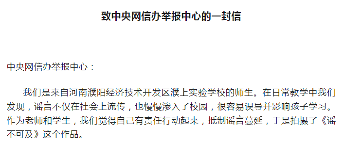 近日,河南濮阳经济技术开发区濮上实验学校来信,讲述师生拍摄短视频《谣不可及》的缘由和过程,并对共建网络文明、共享网络清朗提出期盼。